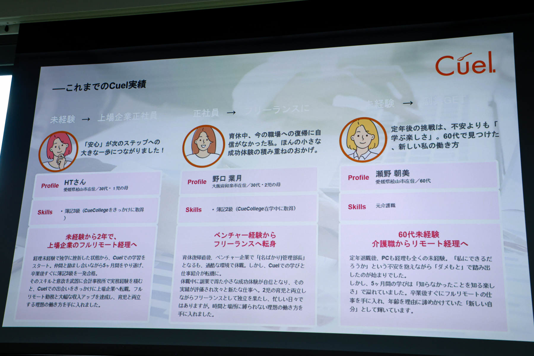 株式会社Cuel 代表取締役・鈴木ひとみ氏は、メリービズとの連携の効果について、一言で「見える化」だと表した。特にブランクのある女性にとって次の一歩を踏み出すことは難しいが、今回の連携により、実際にメリービズで働く人の姿や業務の進め方を知る機会が生まれたという。これによって受講生の仕事や職場への理解度が高まり、「自分にもできそう」「この人と同じ思いを持っている」と感じる人が増えた。結果として、新しい一歩を踏み出す後押しにつながった点を最も大きな成果として挙げた。