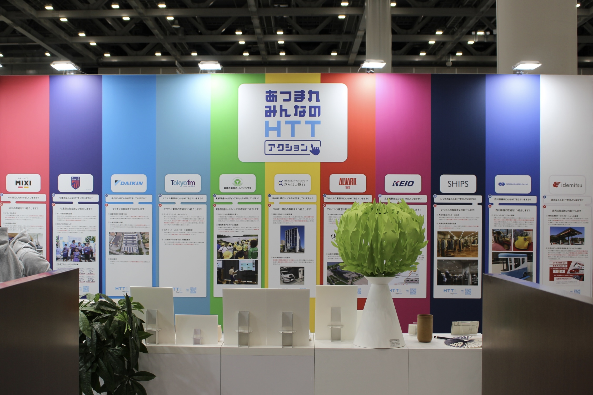 ブース内では、FC東京やMIXI、出光興産、京王電鉄など連携企業11社が自社のHTT実践例を紹介するパネルを展示。省エネ製品、エネルギー関連技術、脱炭素に向けた取り組みなど、来場者がそのまま導入をイメージしやすい内容となっている。
