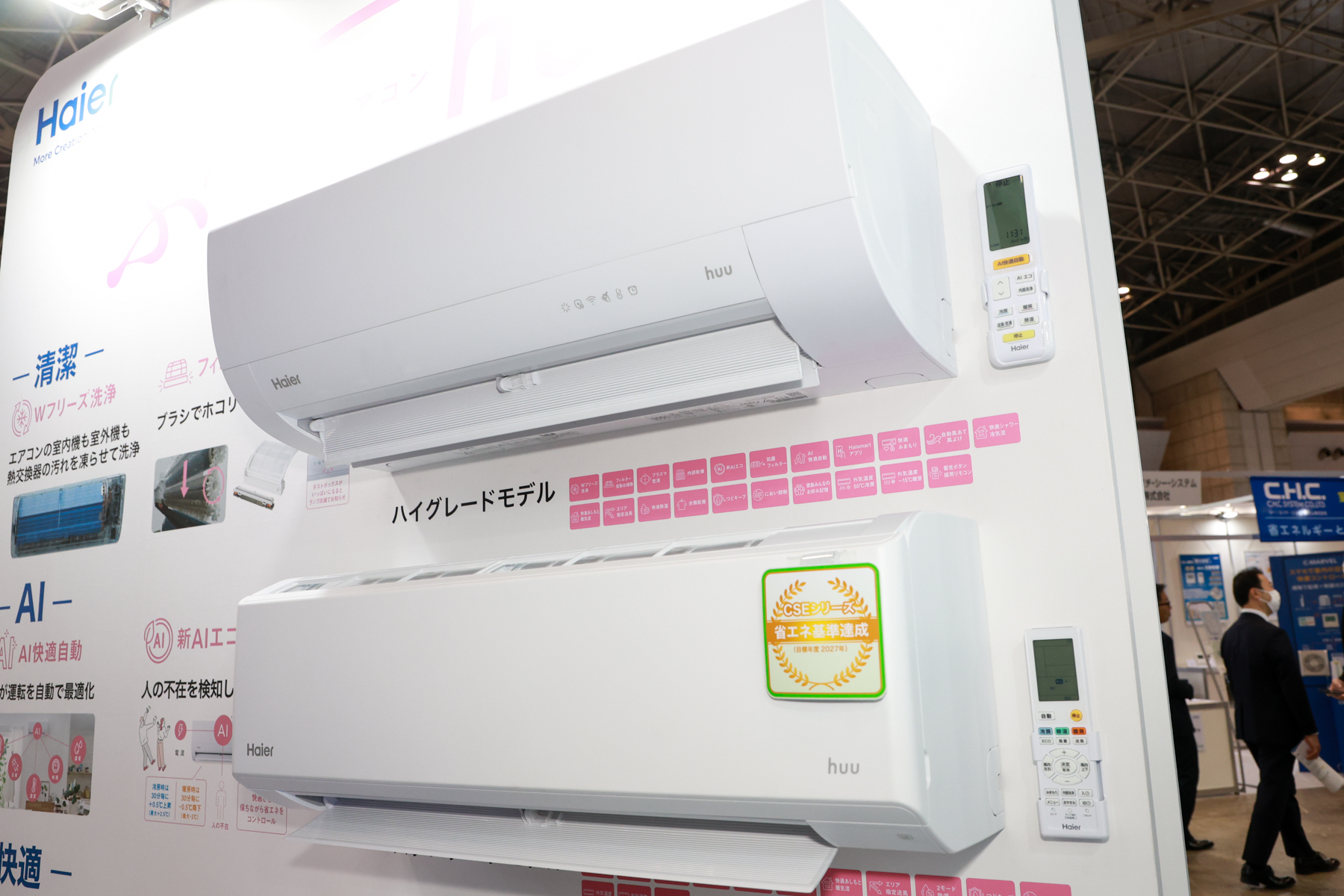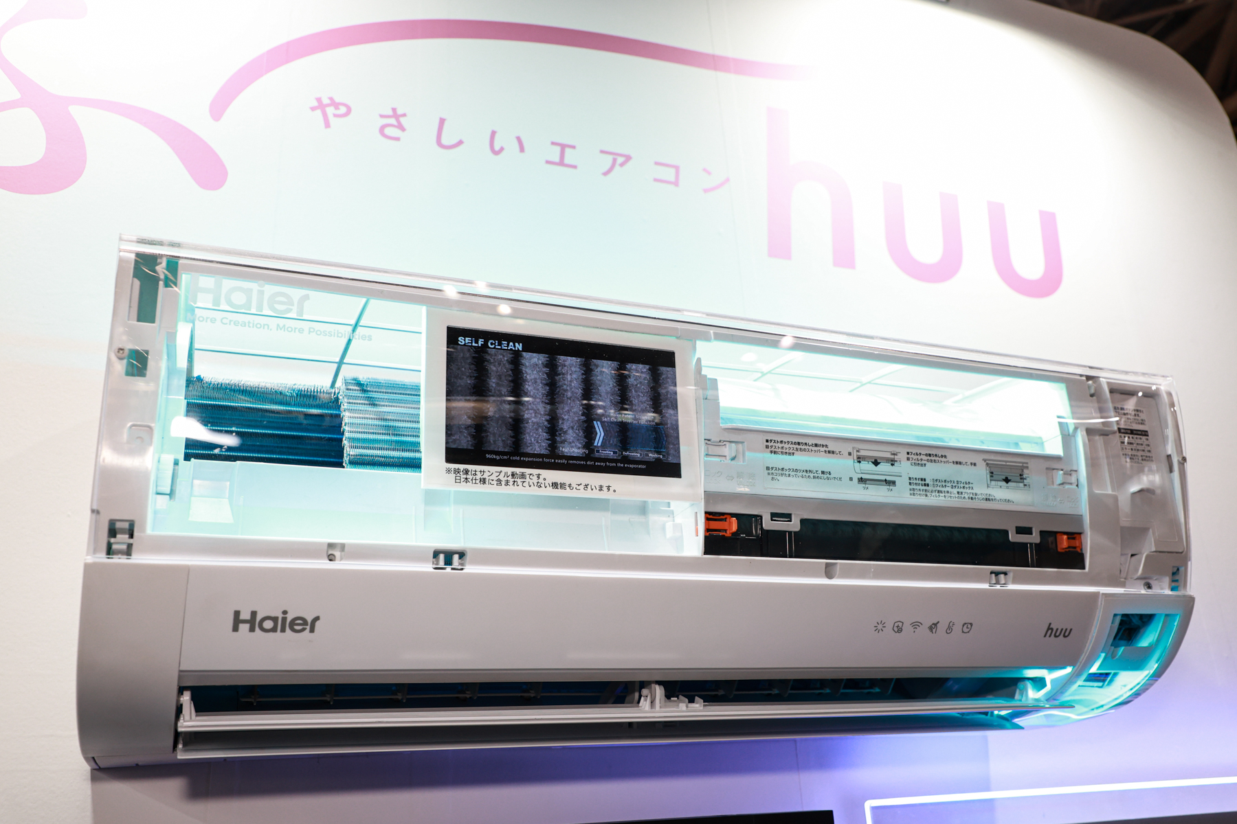 同社のブースでは、年間約2,500万台ものエアコンの生産実績がある、ハイアールグループのエアコンラインナップが紹介されていた。「Haier」では、自動お掃除機能やIoT搭載のハイグレードモデルをはじめとした、家庭用ルームエアコン「huu」を中心に展示を行った。