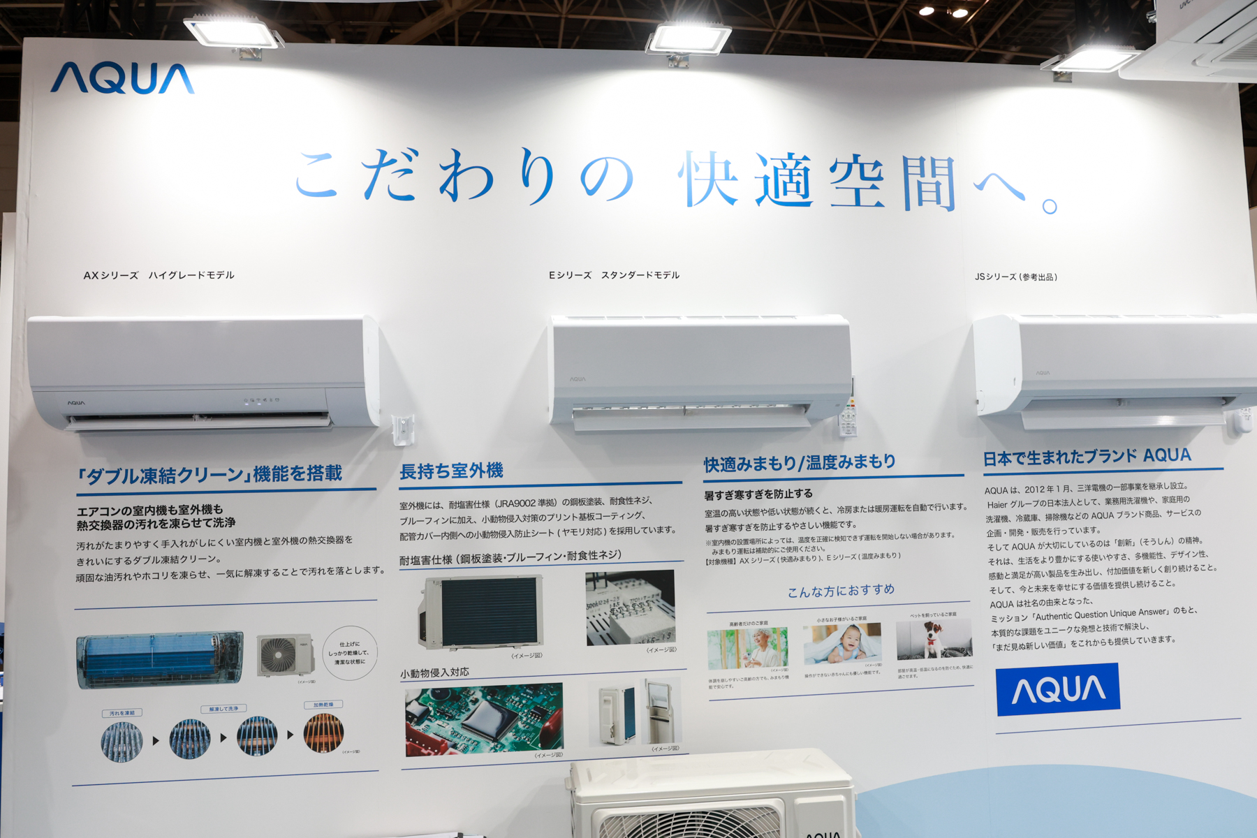 また「AQUA」では、耐塩害対応で長持ちする室外機が特長の、住宅設備用ルームエアコンが展示されていた。さらに、この両ブランド商品に加え、グローバルで展開している商品も見ることができ、ハイアールグループのエアコン事業全体を俯瞰できる構成となっていた。