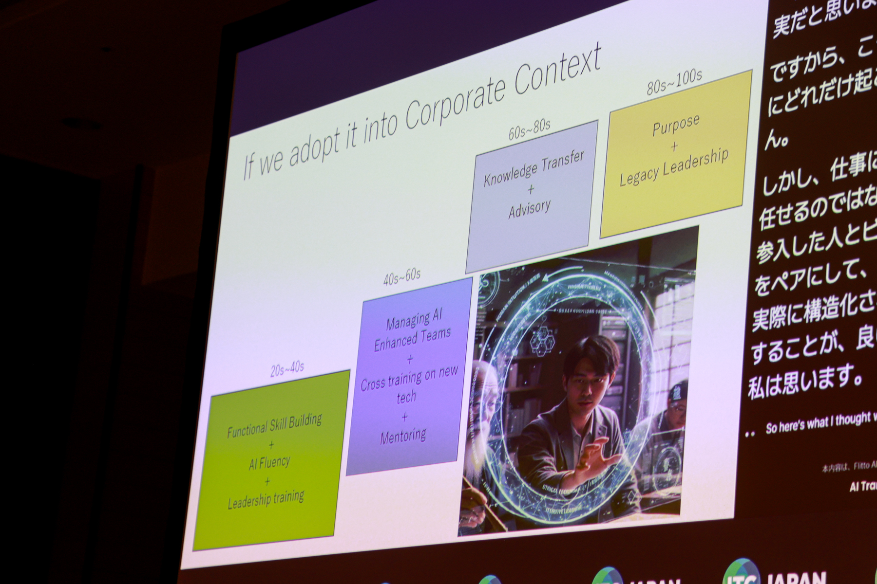 さらに、若手とベテランを組み合わせた協働モデルを制度化し、AIをチームの一員としてマネジメントする力を育てる必要性を提起。高齢層が第一線を退いた後も「Wisdom in the Loop(知恵の循環)」として関わり続ける仕組みを構築することで、世代を超えた価値創出が可能になると締めくくった。