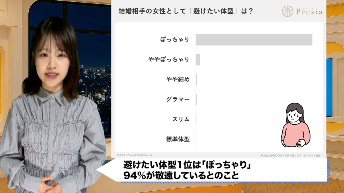 避けたい体型1位は「ぽっちゃり」。94%が敬遠しているとのこと。厳しい結果になっています。