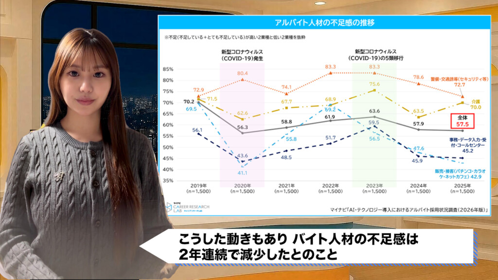 こうした動きもあり、バイト人材の不足感は2年連続で減少したとのこと。