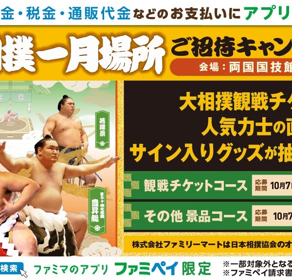 ファミリーマートは、公共料金や税金などの支払い時にファミペイアプリを提示してスタンプを集めると、抽選で大相撲一月場所の観戦チケッ...