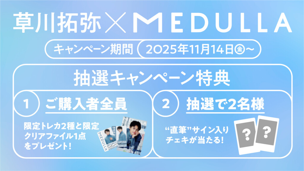 キャンペーン期間中、対象商品であるMEDULLA×草川拓弥の限定コラボ5点セットを購入いただいた方には、草川拓弥限定トレカ2種類と限定クリアファイル1種の合計3点を、数量限定でプレゼントする。