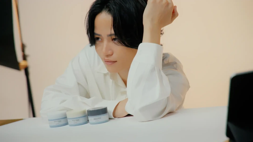 今回の撮影は、自然に囲まれたり、すごくスタイリッシュでおしゃれで透明感を感じられる白い世界観で、SHIKARIで洗った肌がきれいに映し出されていて、映えていると思いますので、テカテカのつるつるの肌を見ていただけたらなと思います。