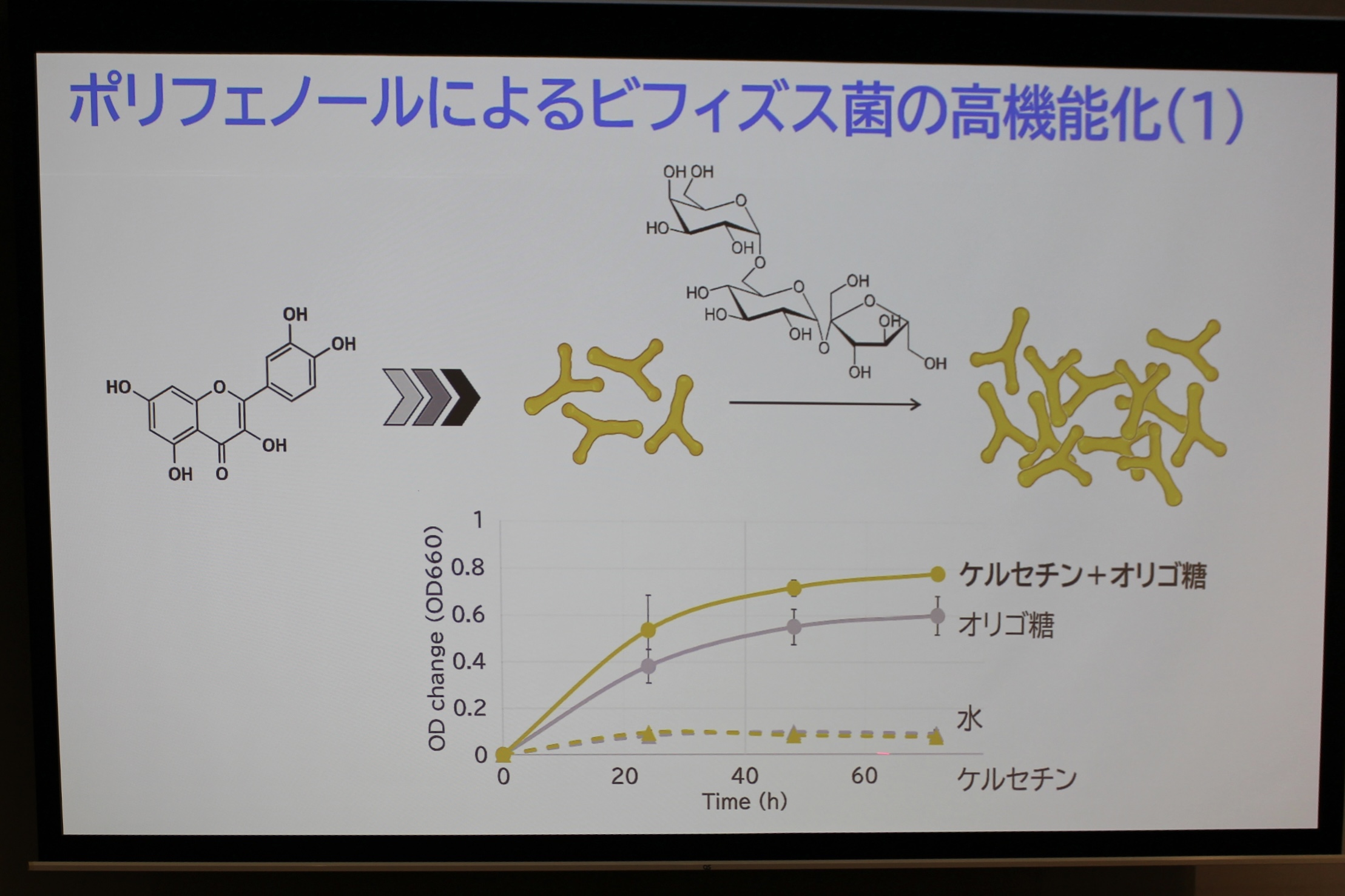 最近の研究として、ポリフェノールによるビフィズス菌の高機能化について解説。腸内フローラを整える役割を担っているのではと研究を続けている。また、腸内細菌がそもそも持っている機能をさらに高めるという形で新しい機能を引き出す効果があるのではないかと期待して行った研究では、抗炎症活性を高める結果が確認できている。複数の研究から、「将来、その人に適したポリフェノールを提案できるようになるのでは」と川畑氏は見解を示した。