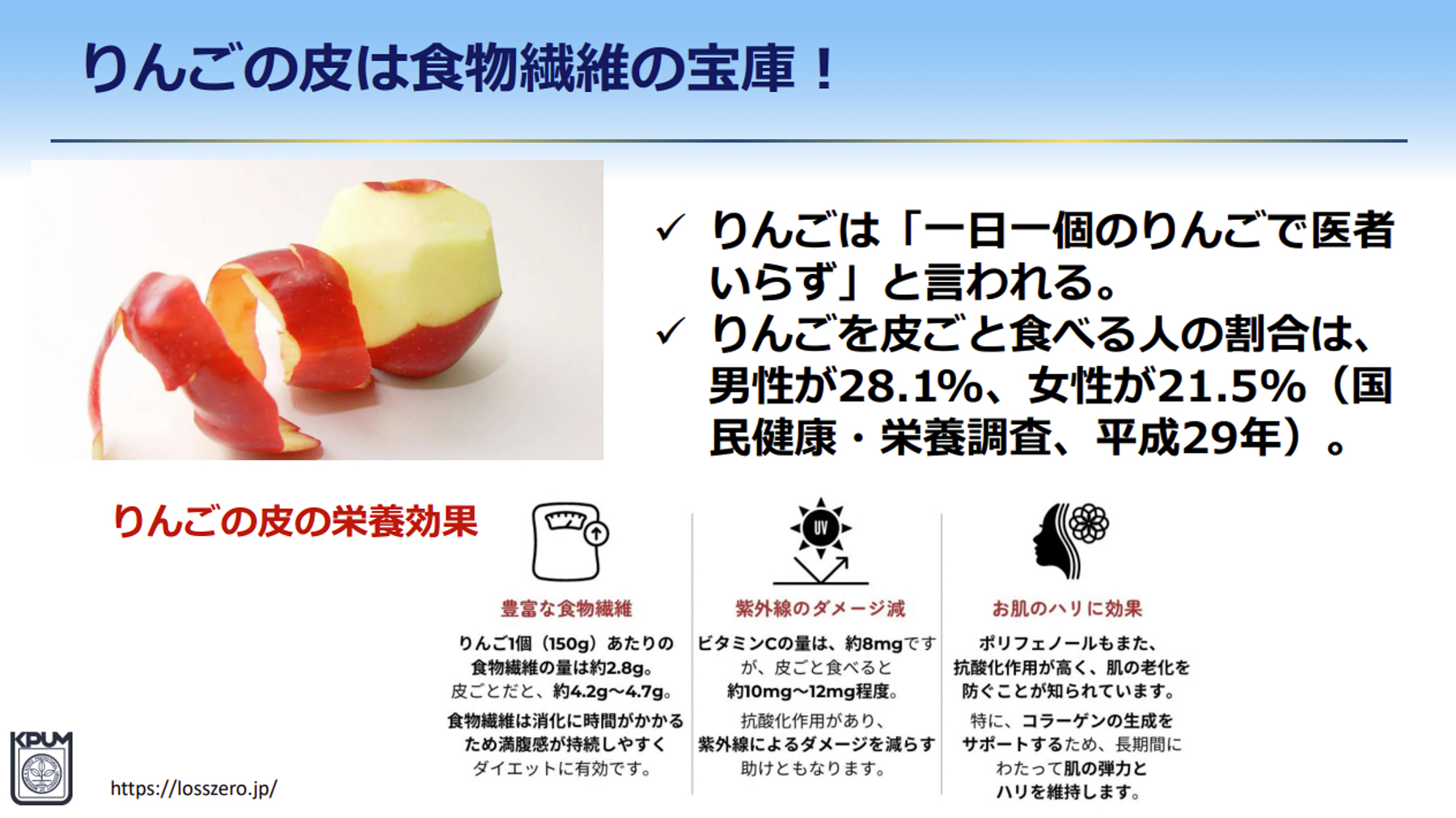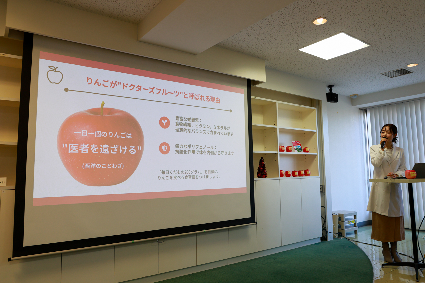 工藤先生は「りんごが“ドクターフルーツ”と呼ばれる理由」について、「豊富な栄養素(食物繊維、ビタミン、ミネラル)が含まれていて理想的なバランスであること」と「強力なポリフェノールの抗酸化作用で体を内側から守る」という2つの理由を挙げた。その上で、「毎日果物200g」を目標にりんごを食べる食習慣を身につけることが重要だと述べた。