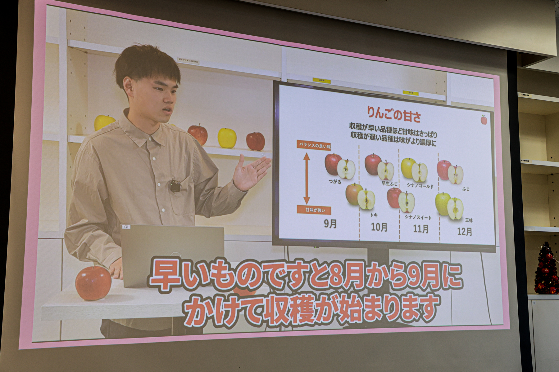 そして、年間100万円以上を果物に使うというりんごマニアのはたんきょーさんがビデオ出演し、マニアならではの視点でりんごに関する目利き方法や保存法など、知っておくと役立つりんごの意外と知らない豆知識が紹介された。