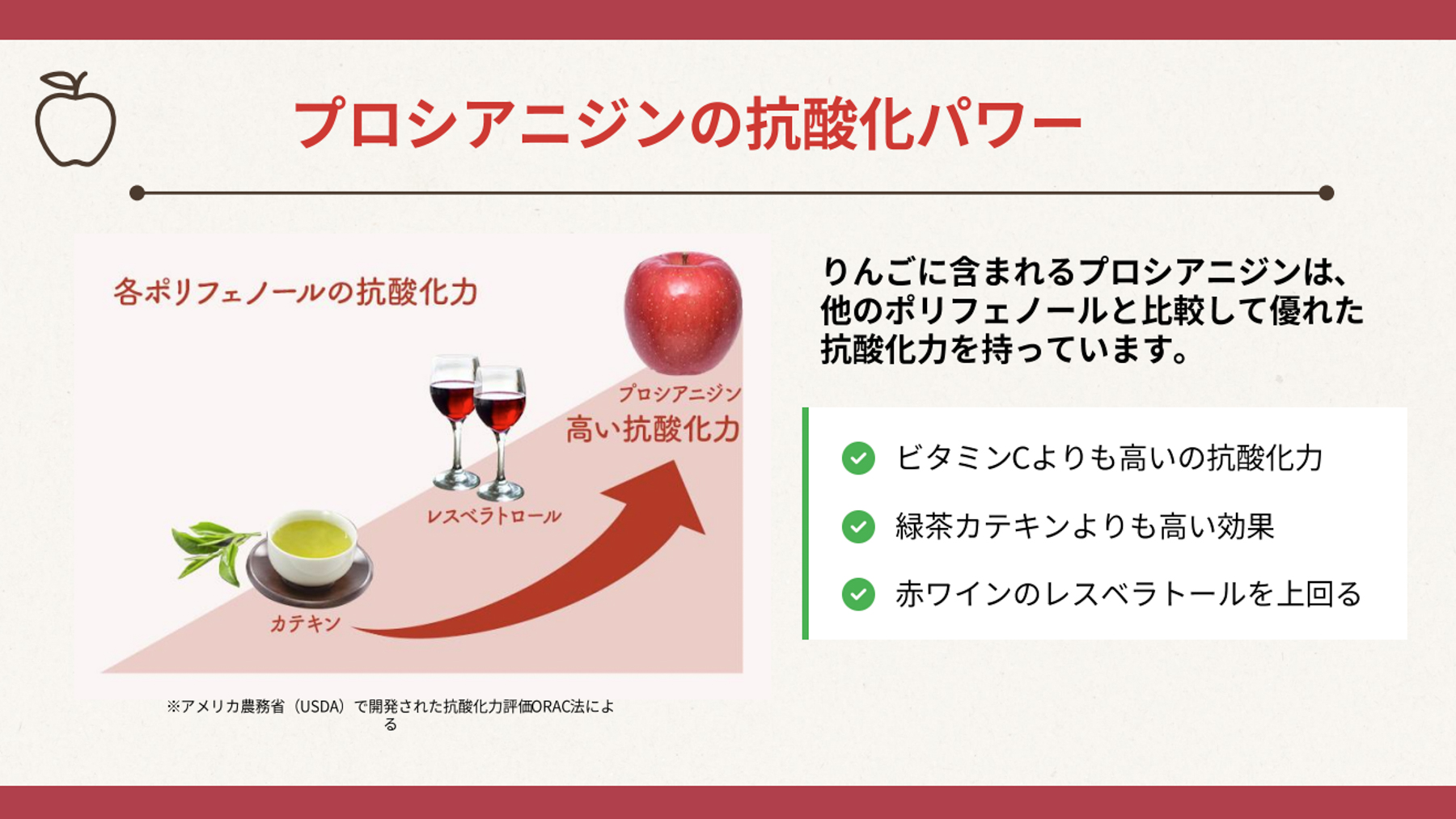 ポリフェノールにも複数の種類があり、りんごのポリフェノールは「プロシアニジン」が主成分で、全体の約60%を占める。プロシアニジンは、「他のポリフェノールより優れた抗酸化力がある」「活性酸素(体内のサビ)を除去する」「『ふじ』や『王林』にやや多く含まれる」という特徴がある。