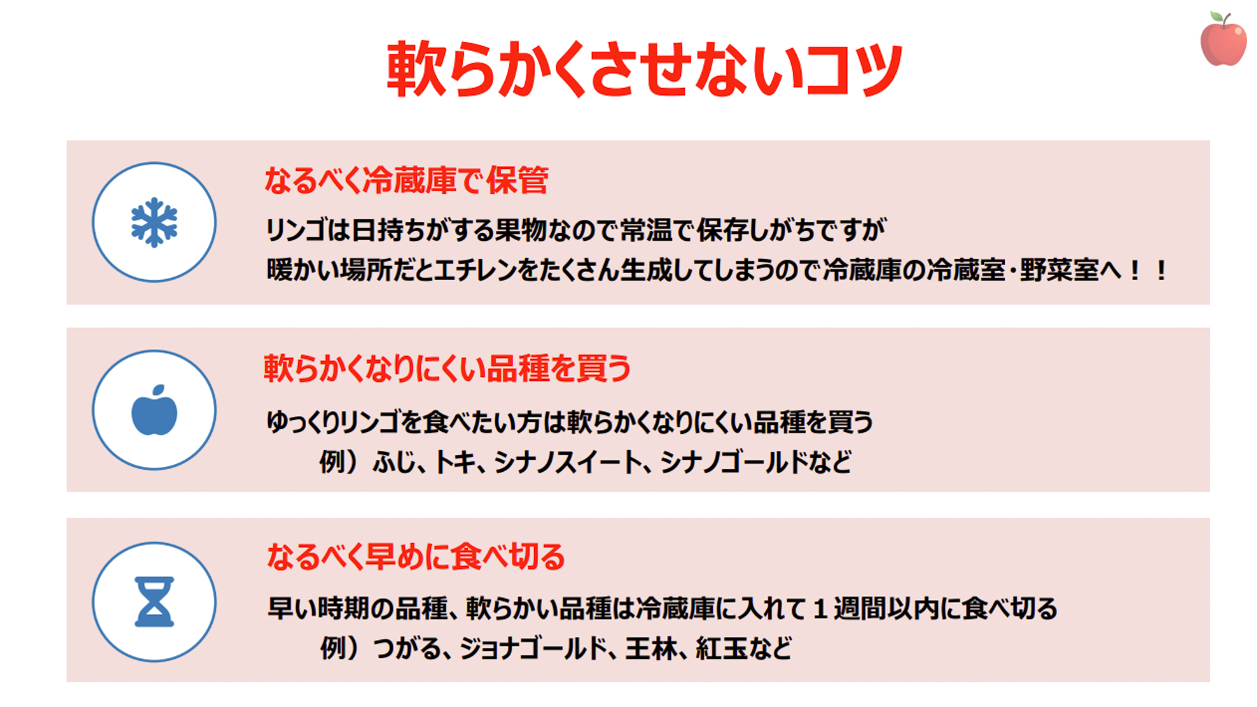家庭でりんごを買うときに、りんごを軟らかくさせないコツとしては「なるべく冷蔵庫で保管する」「軟らかくなりにくい品種を買う(例:ふじ、トキ、シナノスイート、シナノゴールド)」「なるべく早めに食べきる」ことだと解説した。
