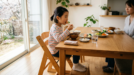 飲み込み方や食事中の姿勢も重要だ。足の裏をしっかり床につけ、左右の奥歯でバランスよく噛むことが、お口の健やかな成長につながるそうだ。