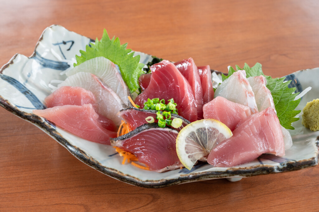 刺身盛り(まぐろ、太刀魚、タコ、サーモン、かつおたたき、クジラ肉)、寿司(イカ、まぐろ、つぶ貝、蒸しエビ、えんがわ)。