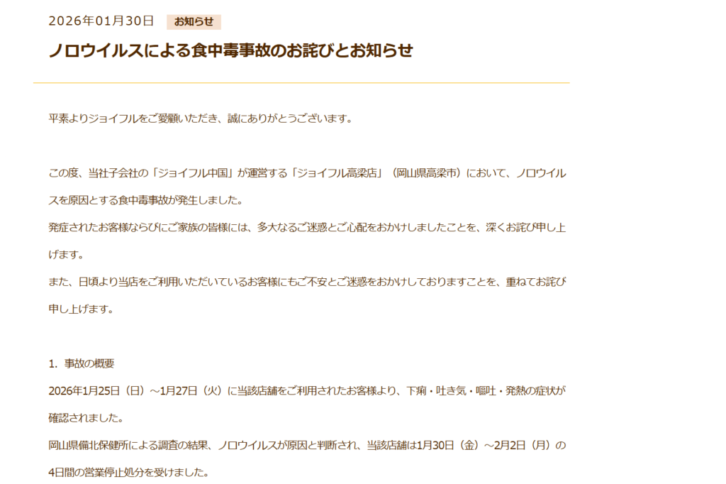 『ジョイフル』はホームページで、「発症されたお客様ならびにご家族の皆様には、多大なるご迷惑とご心配をおかけしましたことを、深くお詫び申し上げます」と謝罪した。